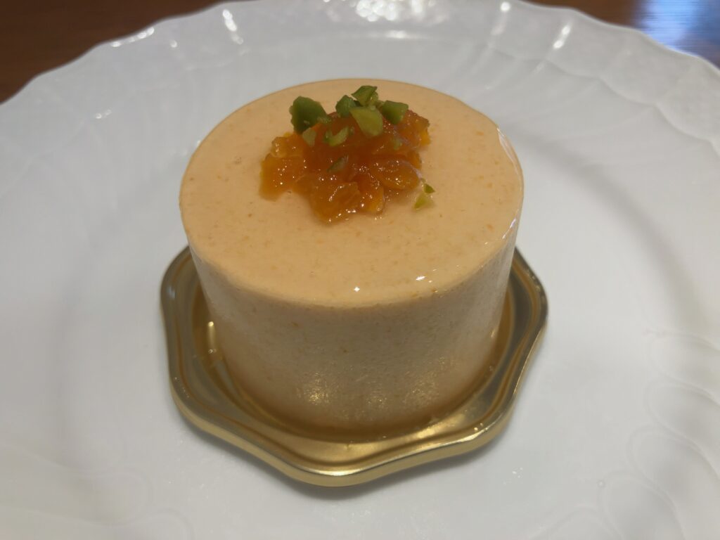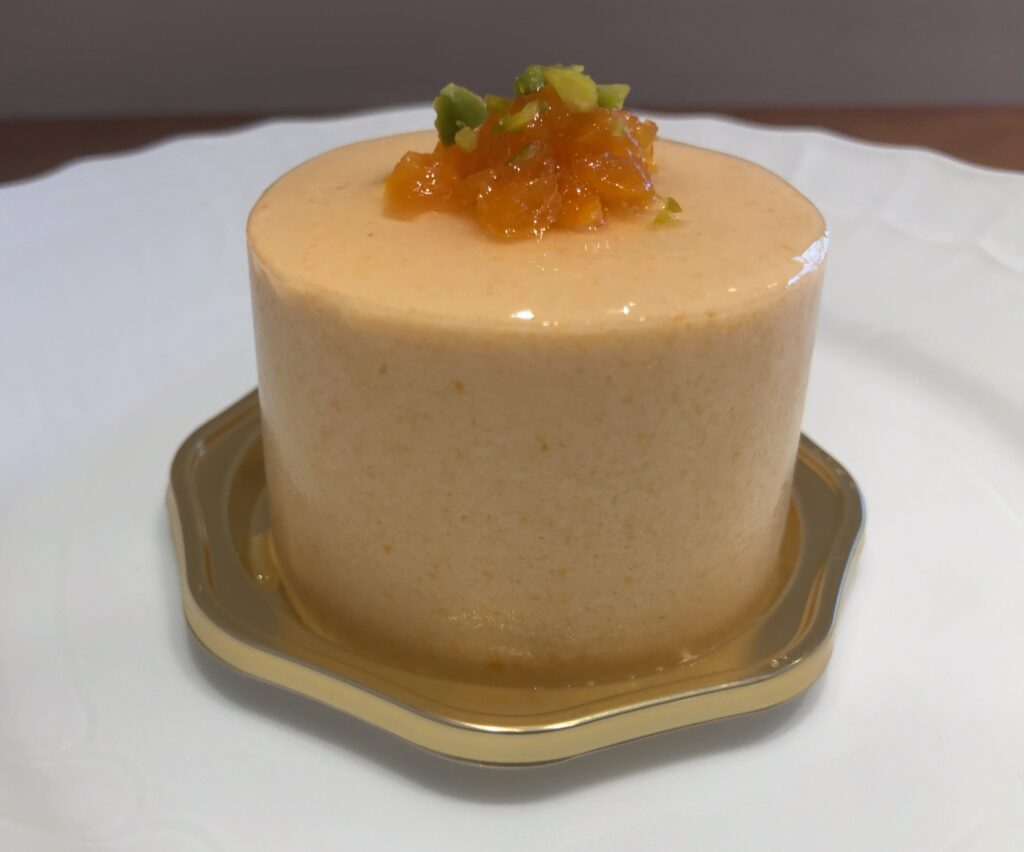 アプリコットの甘酸っぱいムースにピスタチオのコクと香り。