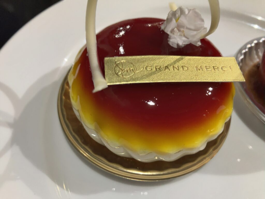 フランボワーズのジュレ、パインジュレ、ホワイトチョコレートムースにココアスポンジという構成。