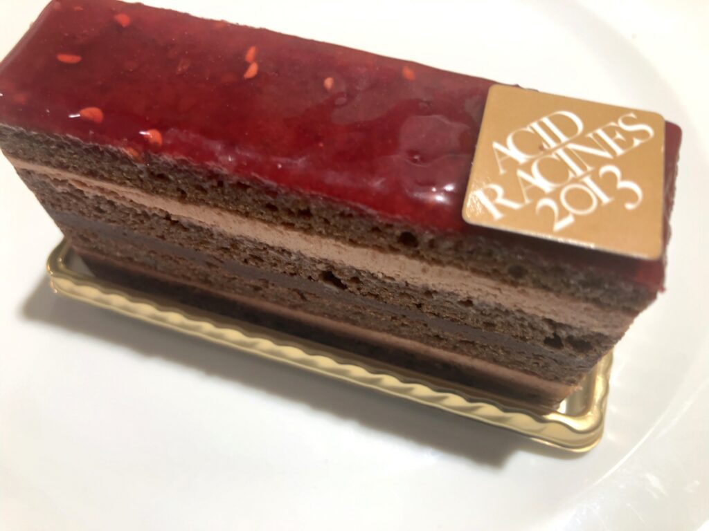 チョコレートの生地とミルクチョコレートのムース、スイートチョコレートのガナッシュクリームとフランボーズのジュレ。